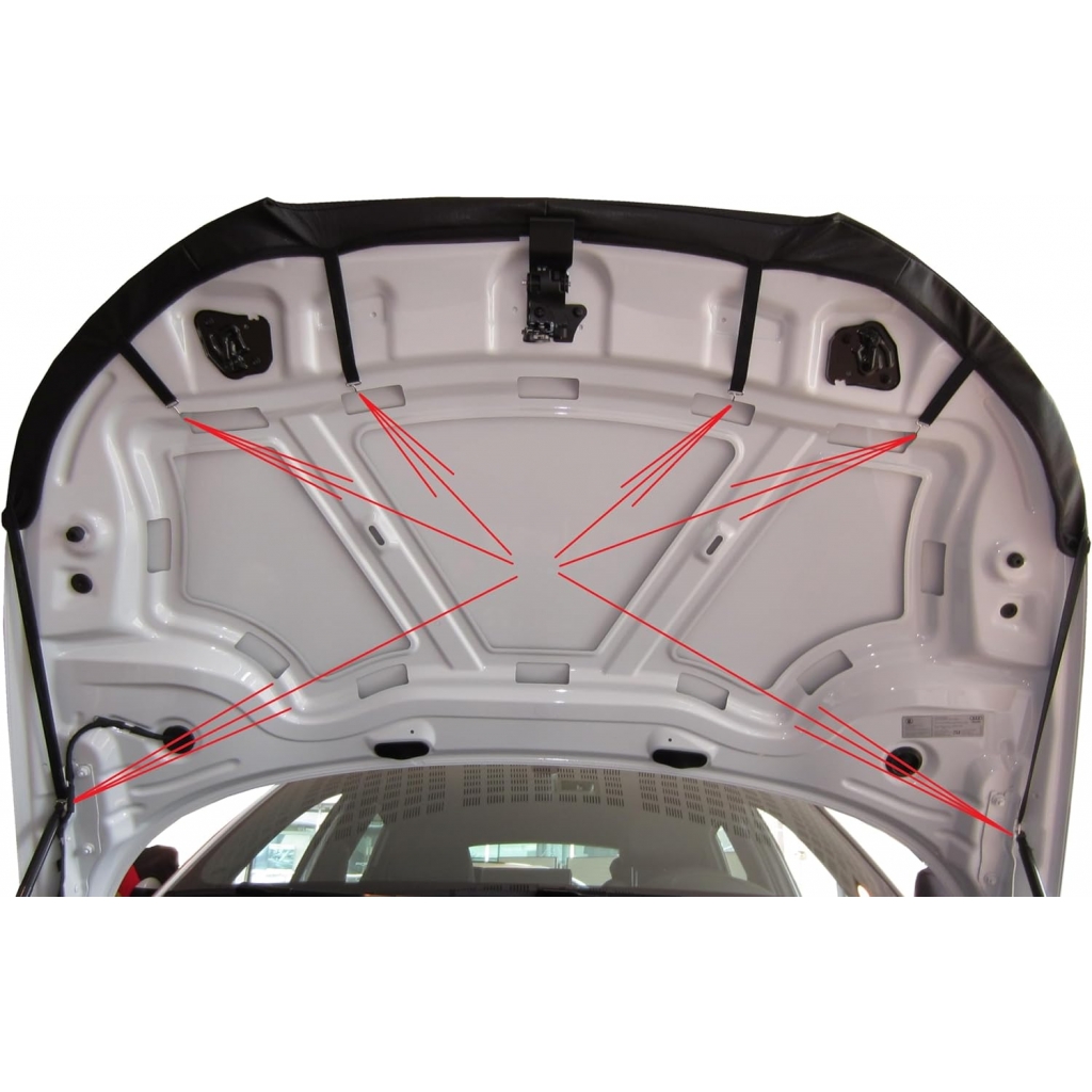 Дефлектор капота предотвращает царапины и другие повреждения на автомобильной краске. Дефлектор должен быть правильно надет на капота и затянут. Резиновые ремни с крючками гарантируют надежную фиксацию.